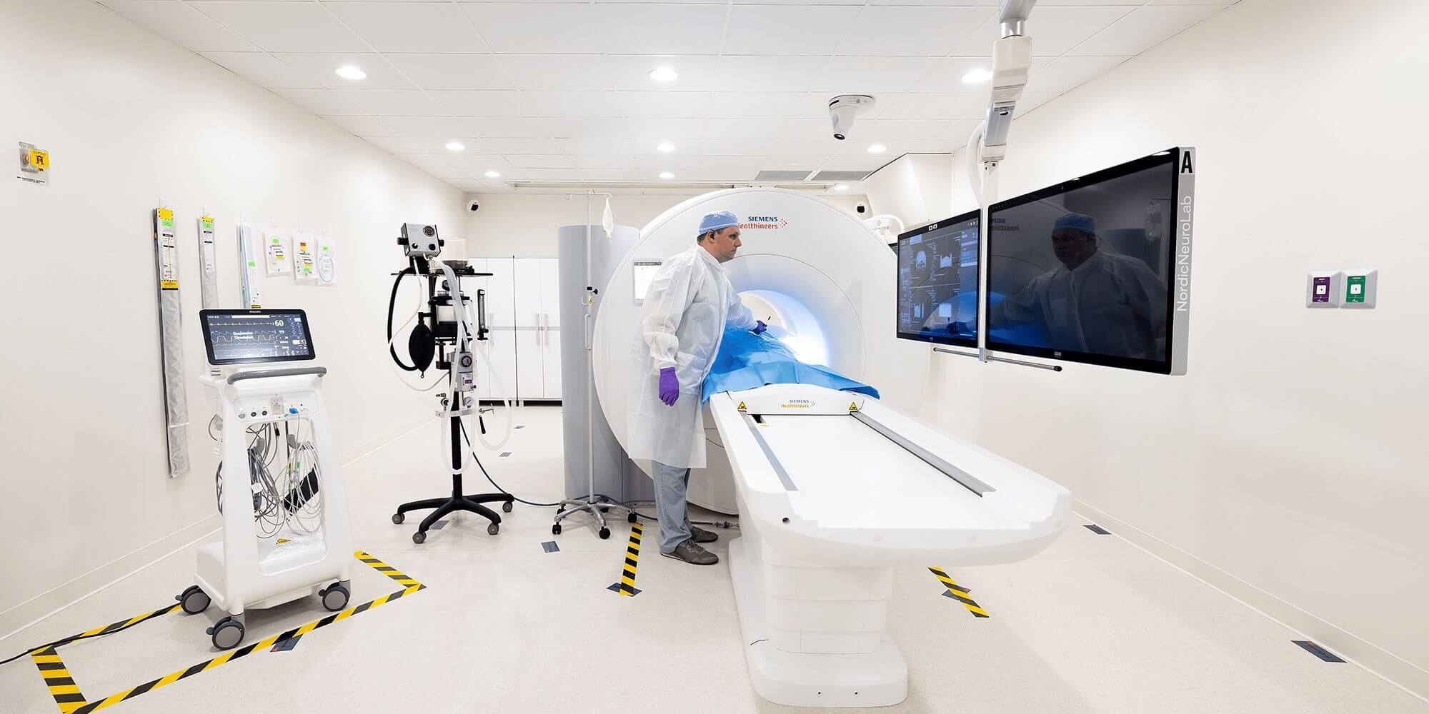 An MRI suite. A doctor stands beside an MRI machine, reviewing the information on suspended monitors. Behind him are additional medical monitoring devices.