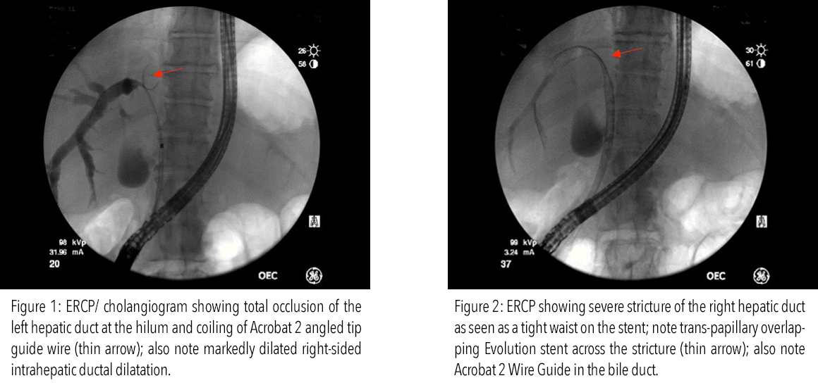 Two stents were used to bridge the hilar stricture since the affected location was high into the intrahepatics. By overlapping two Evolution stents, we traversed the hilum to the papilla.