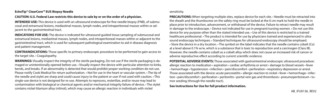 Continuing Cook Medical’s 25+ years of innovation in endoscopic ultrasound (EUS), the 22 gage EchoTip® ClearCore™ EUS Biopsy Needle is used with an ultrasound endoscope for fine needle biopsies (FNB) of submucosal and extramural lesions, mediastinal masses, lymph nodes, and intraperitoneal masses within or adjacent to the gastrointestinal tract.