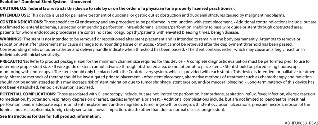 Under deep sedation with propofol, the patient underwent ERCP that failed for a tight stricture of the second part of the duodenum. During the procedure we decided to place a duodenal 6 cm Evolution stent (Cook Medical EVO-22-27-6-D) after a measurement of the length of stenosis with the guide catheter (Cook Medical SIS-10). The deployment of the Evolution stent under fluoroscopy was comfortable as usual.