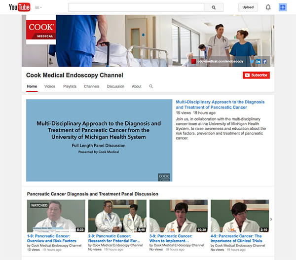 Our channel will include endoscopy-related procedural and product education, clinical case videos, and updates on the latest innovations from Cook Medical. For easy navigation we’ve organized our videos into procedural and disease categories, which include ERCP, EMR, Hemostasis, EUS, Stricture Management, and Disease Awareness.
