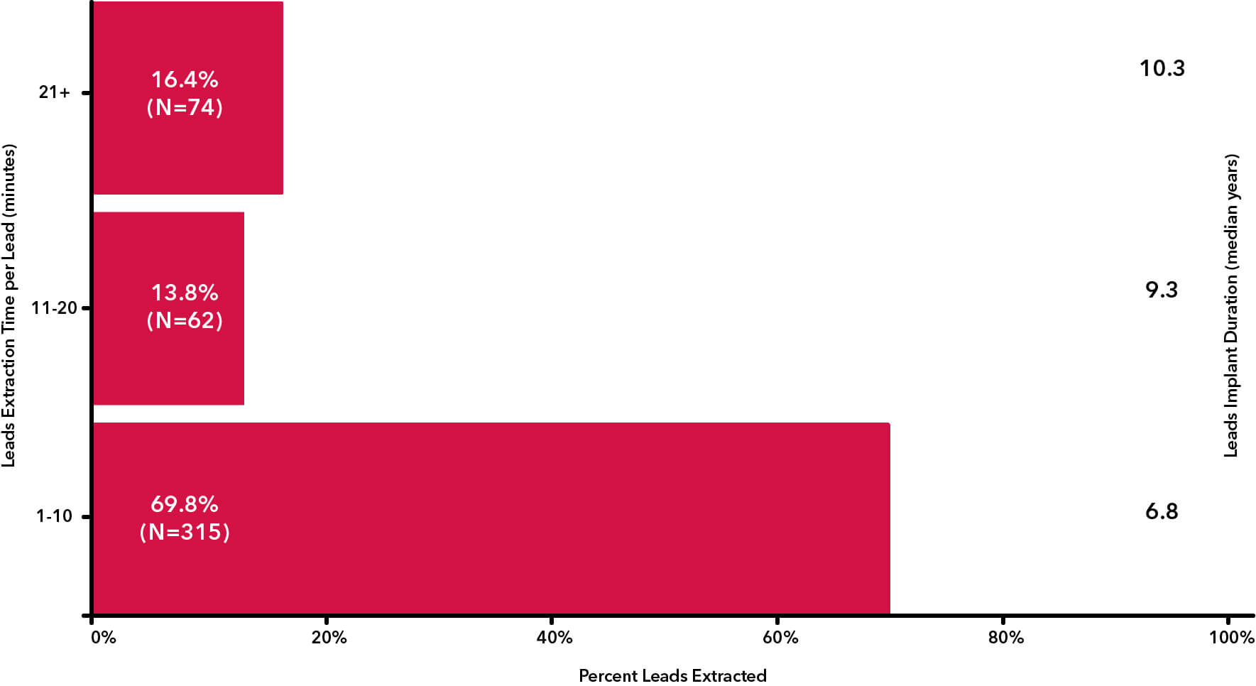 In the 2021 RELEASE study,8 exclusively using the Evolution RL, extraction times were recorded for 98% of leads (451/460). Those leads had a median implant duration of 7.4 years. The median procedure time was 10 minutes with a median extraction time per lead of 4 minutes.8 The ELECTRa study, which used various device platforms for lead extraction, reported a median extraction time of 19 minutes with a median implant duration of 5 years.11