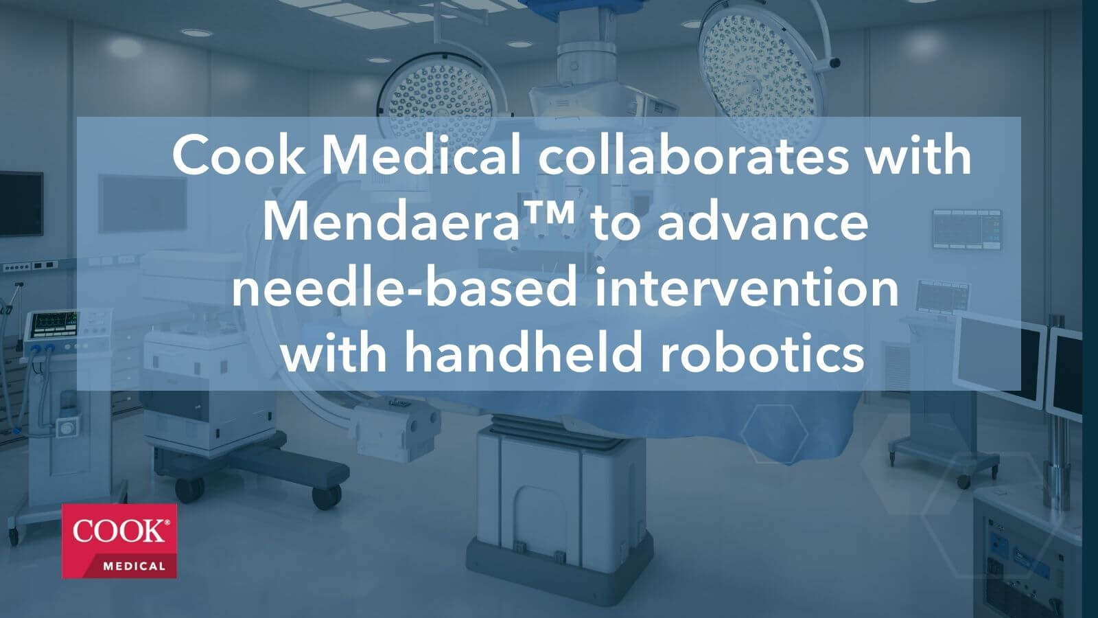 Bloomington, Ind. — Cook Medical announced a collaboration with Mendaera™ Inc., a Silicon Valley-based healthcare technology company. The goal of this collaboration is to create cutting-edge solutions for needle-based interventions in urological procedures by combining Cook’s market-leading needles with Mendaera’s handheld robotic platform. Together with Mendaera, we are excited to pursue new opportunities in percutaneous procedures.