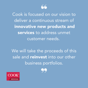 “Cook is focused on our vision to deliver a continuous stream of innovative new products and services to address unmet customer needs. Part of achieving that business strategy has included reviewing our product portfolio and identifying what product lines are the best fit for Cook moving forward and which might have more opportunity to grow or thrive elsewhere. We will take the proceeds of this sale and reinvest into our other business portfolios,” said Mark Breedlove, senior vice president Cook Medical’s Vascular Division. “Merit plans to leverage the skills, expertise and deep relationships Cook has built within the space to grow in this market.