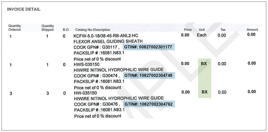 GTINs are unique, global product-identification numbers. GTINs are usually barcoded on product packaging. They identify the manufacturer, the product, and the unit of measure. Cook Medical uses 14-digit GTINs.