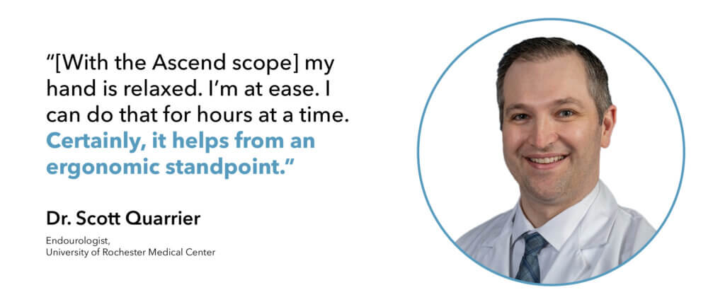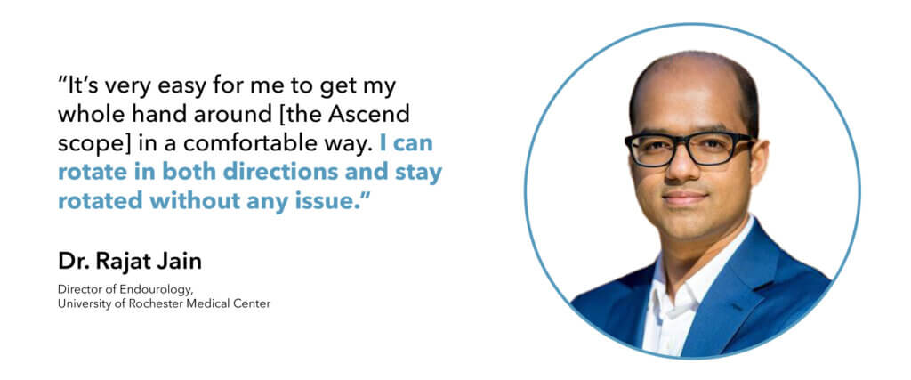 By leveraging an ergonomic single-use ureteroscope that also features enhanced illumination and intuitive, controlled deflection, you can operate with greater confidence and precision. This, in turn, contributes to more efficient procedures, reduced operation time, and potentially improved patient outcomes. (Learn more about all the features of the Ascend scope here.)