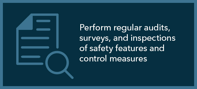 - Perform regular audits, surveys, and inspections of safety features and control measures